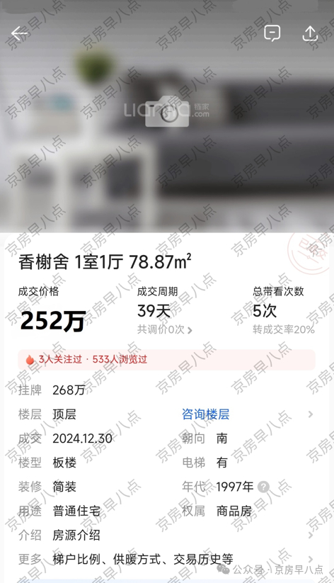 举几个东三环的成交吧:香榭舍在2024年12月成交了一套一居室,成交价是252万,成交单价是3.1万/平。
