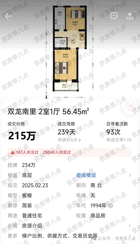 双龙南里在2025年2月成交了一套两居室,成交价是215万,成交单价是3.8万/平。