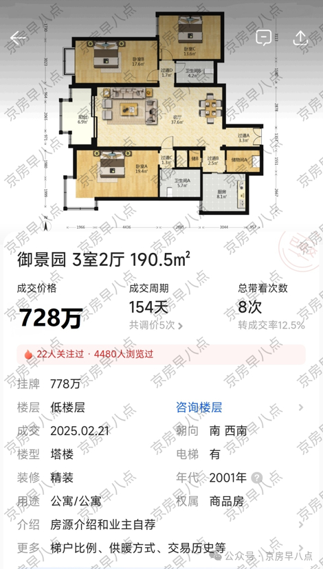 御景园在2025年2月成交了一套三居室,成交价是728万,成交单价是3.8万/平。
