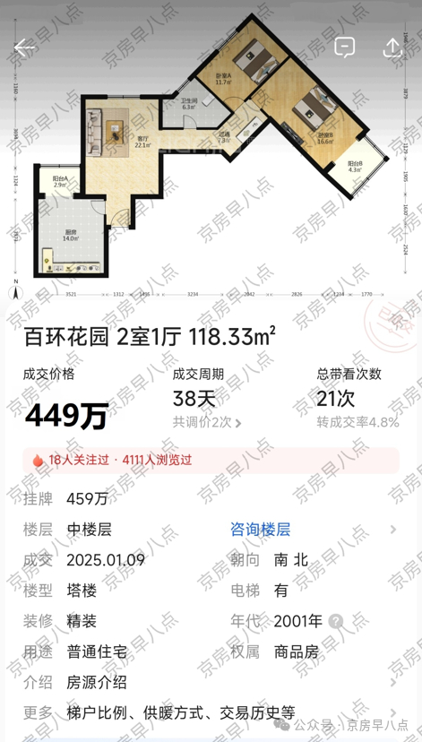 百环花园在2025年1月成交了一套两居室,成交价是449万,成交单价是3.7万/平。