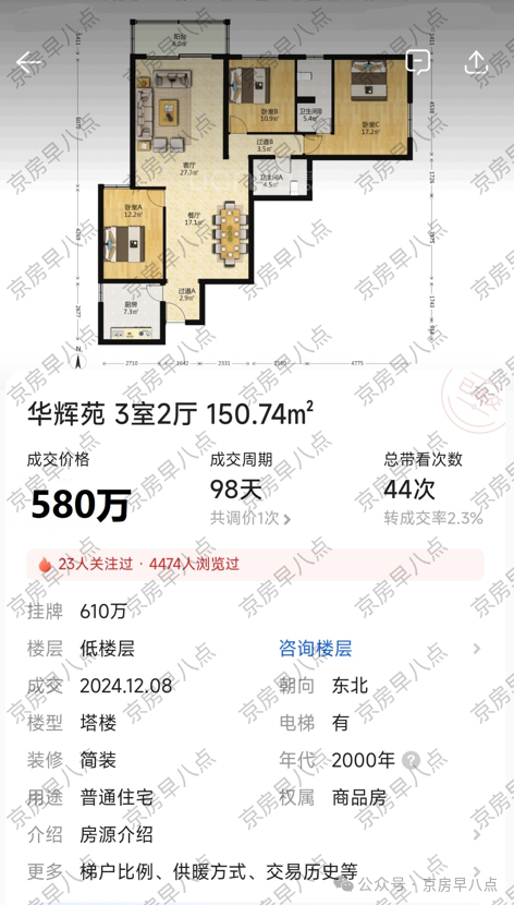 华辉苑在2024年12月成交了一套三居室,成交价是580万,成交单价是3.8万/平。