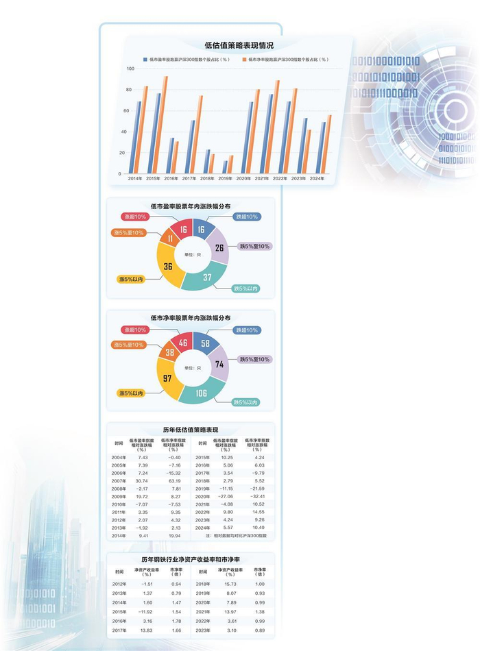 在业内人士看来,低市净率可能反映资产质量差或行业困境,而非低估。除了钢铁行业外,近期更为典型的低市净率陷阱还有房地产行业。比如某龙头房企2021年底股价破净,但此后连跌4年。高负债、资产变现能力差、政策与市场周期等多重压力,使得地产行业价值被重估,业内低估值股票也胜率偏低,跑赢沪深300指数个股占比仅为48%左右。
