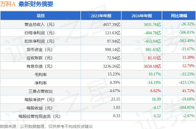 万科A2024年年报简析:净利润减506.81%