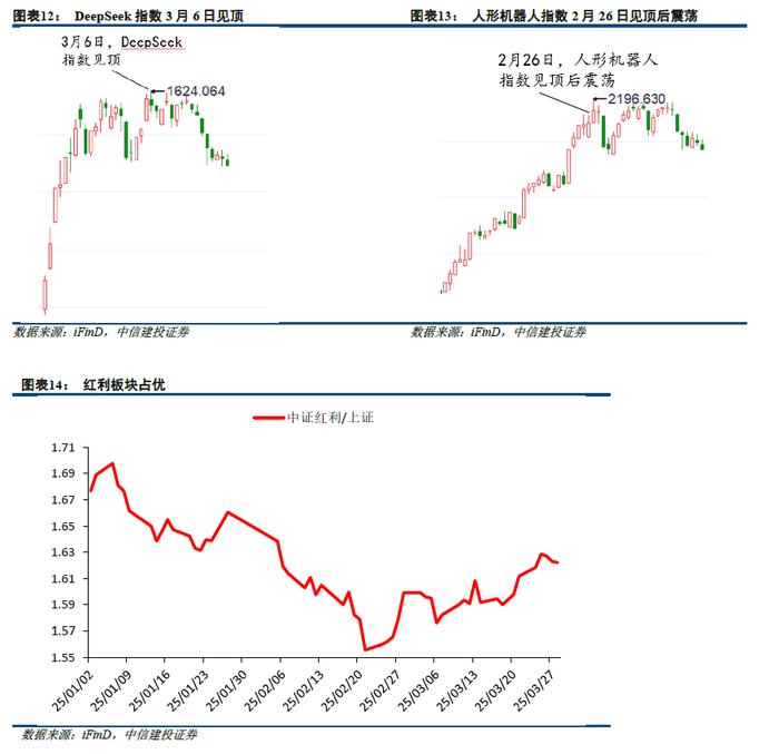 阶段三(3.8-3.31):DeepSeek与人形机器人双主线均见顶,资金从中流出,板块缩量轮动。3月初DeepSeek与人形机器人见顶,前期高位个股见顶回落。前期热点熄火后,市场处于缩量轮动状态。该阶段市场风格切向大盘价值,小微盘股重挫,红利板块占优。资金主要聚焦“涨价”板块(小金属锑、铋等价格出现大幅上涨