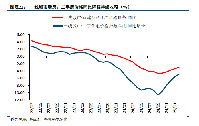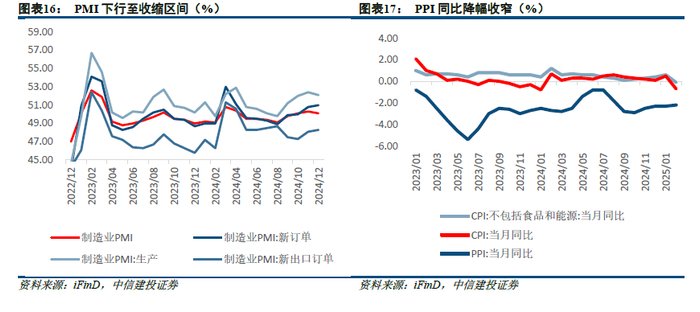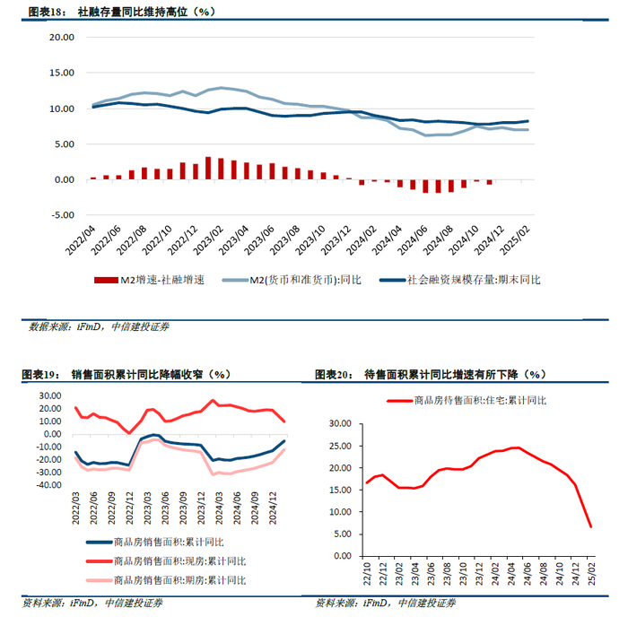 2月发布的经济数据显示经济处于筑底状态。社融数据修复,企业与个人风险偏好回升。社融存量同比维持8.0%高位,1月新增贷款5.13万亿元,同比多增2100亿元,增幅较2024年同期明显增长。M1受季节性扰动增速回调,M2增速小幅回落。2025年1月修正后M1同比0.4%,增速较2024年12月收窄0.8pct。M2同比+7.0%,增速较2024年12月略降0.3pct。地产数据也出现边际修复。商品房销售面积累计同比降幅收窄,待售面积累计同比增速有所下降,一线城市新房、二手房价格同比降幅持续收窄。此外,2月PMI为50.2%,比上月上升1.1个百分点重回扩张区间,制造业景气水平明显回升。