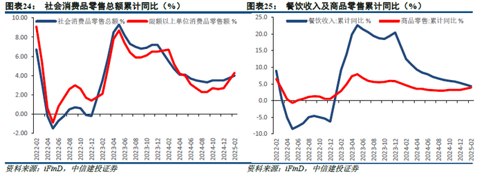 3月公布的经济数据中显示生产整体向好,结构分化较为明显。2025年1-2月,工业增加值的当月累计同比增速为5.9%,这一数据较去年同期有所下降。从季调环比数据来看,2月工业增加值环比增长0.51%,而1月环比增速为0.19%。1月的环比增速相较于往年处于较低水平,2月则处于同期的平均水准。目前生产端的表现较为强劲。社零数据显示消费需求出现修复,1-2月我国社会消费品零售总额83,731亿元,同比增长4.0%,商品零售和餐饮收入增速较上月均有所回升。具体来看,受春节假期影响,居民消费需求短幅提升,餐饮收入有较明显的提升,1-2月累计同比增速+4.3%,商品零售累计同比增速+3.9%,与去年持平。