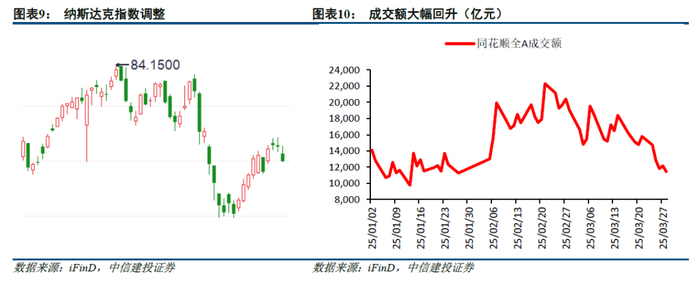 3月初,TMT板块交易过热叠加海外利空影响,指数震荡调整。TMT板块交易额占比一度达到历史最高位水平,整体板块回调,资金逐渐由科技板块流出。并且海外不确定性再起,继特朗普2月重启贸易战后,又相继发布了美国优先投资政策并加大对华关税税率。2月27日,特朗普表示,在3月4日正式对加拿大和墨西哥加征25%的关税的同时,将会对中国额外再征收10%的关税。
