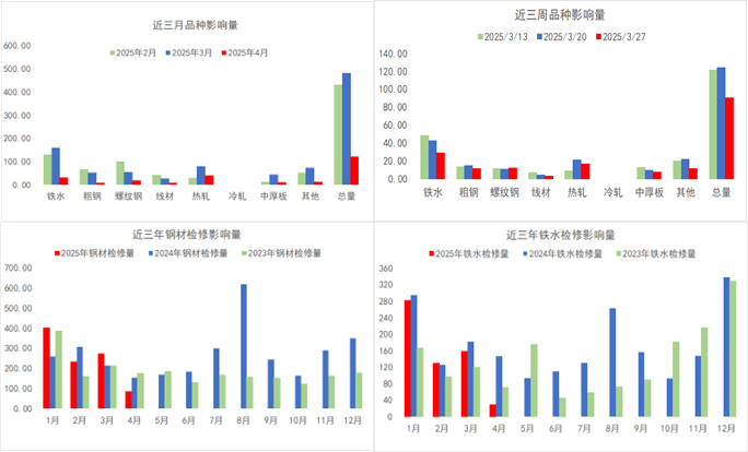从钢厂减产检修计划来看,4月份检修钢厂数量较3月份有所下降,同比来看钢厂减产力度也小于去年同期。分品种来看,据找钢大数据研究院不完全统计,上周(03/21-03/27)钢厂检修影响总量为90.62万吨,周环比减少33.82万吨,其中影响铁水28.83万吨(环比下降13.66万吨),粗钢11.25万吨(环比下降3.30万吨),螺纹钢11.86万吨(环比增加1.19万吨),线材3.22万吨(环比下降1.39万吨),热轧16.45万吨(环比下降4.80万吨),中厚板7.72万吨(环比下降1.56万吨),其他品种11.29万吨(环比下降10.29万吨)。
