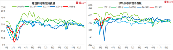从钢材表观消费来看,截至3月26日,找钢大数据研究院跟踪调研的建筑钢材表观消费量342.58万吨,月环比上升123.82万吨,环比增幅56.6%,年同比下降73.55万吨,同比降幅17.67%;热轧板卷表观消费量389.16万吨,月环比上升11.58万吨,环比增幅3.07%,年同比上升35.78万吨,同比增幅10.13%。