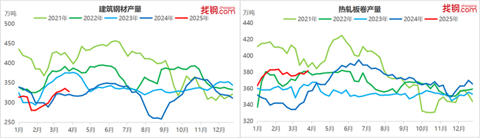 钢材产量方面,截至3月26日,找钢大数据研究院跟踪调研的国内建筑钢材周度总产量为328.03万吨,月环比上升29.31万吨,环比增幅9.81%,年同比上升7.33万吨,同比增幅2.29%;找钢大数据研究院跟踪调研的国内热轧板卷周度总产量为381.59万吨,月环比上升2.2万吨,环比增幅0.58%,年同比上升25.29万吨,同比增幅7.1%。