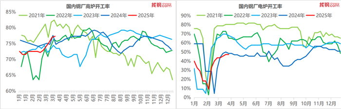 从钢厂生产情况来看,高炉和电炉钢厂开工率双双回升。截至3月31日,找钢大数据研究院跟踪调研的国内独立电炉钢厂开工率为47.27%,月环比上升7.27个百分点,年同比下降1.21个百分点;高炉方面,找钢大数据研究院跟踪的国内高炉钢厂开工率为77.32%,月环比上升4.47个百分点,年同比上升2.56个百分点。