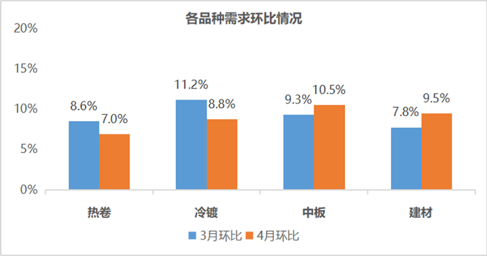 从找钢大数据研究院调研的情况来看,3月份钢材各品种需求量环比2月均有好转,其中热卷增8.6%,冷镀增11.2%,中板增9.3%,建材增7.8%。
