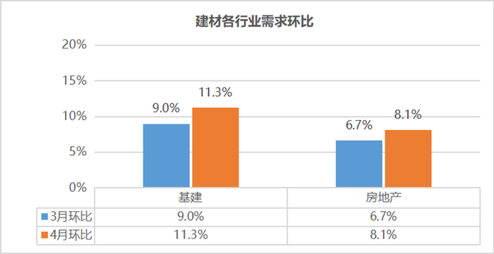 从下游各主要用钢行业来看,建材方面,基建行业3月用钢量环比2月有9.0%的增幅,4月或在3月的基础上继续增长11.3%;房地产行业3月用钢量环比2月有6.7%的增幅,4月或在3月的基础上继续增长8.1%。