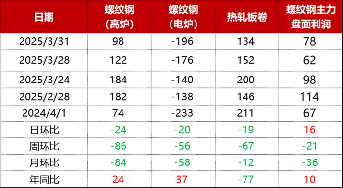 钢材利润方面,3月份国内高炉钢厂生产小幅盈利,但电炉钢厂以亏损为主。截至3月31日,找钢大数据研究院调研的高炉和电炉钢厂螺纹钢吨钢生产利润分别为98元/吨和-196元/吨,月环比分别下降84元/吨和58元/吨;高炉钢厂热轧板卷吨钢生产利润为134元/吨,月环比下降12元/吨。