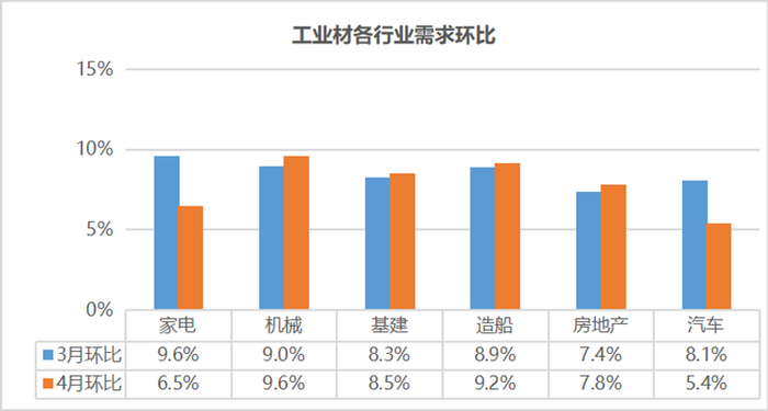 工业材方面,3月家电、机械、基建、造船、房地产和汽车行业需求均保持增势,其中家电和机械行业需求表现最为亮眼。从预期情况来看,4月以上6大行业需求或继续增长,其中机械行业需求增幅最为明显,4月或增9.6%。