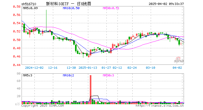 新材料50ETF(516710)开盘涨0.00%,重仓股宁德时代涨0.46%,万华化学涨0.00%