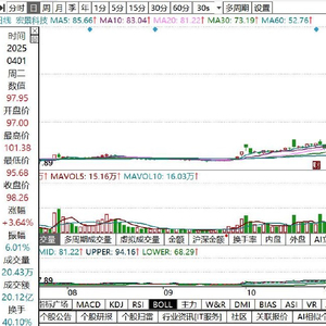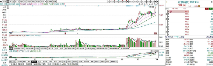昨日,宏景科技的股价继续上涨,并创下历史新高,最高报101.38元/股,当日收涨3.64%,报98.26元/股,总市值107.7亿元。