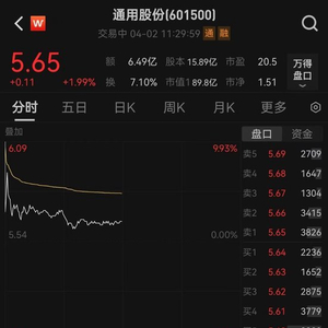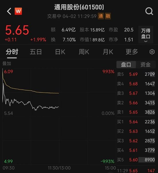 4月2日,通用股份(601500.SH)复牌开盘大涨超9%,随后有所回落。截至早盘收盘,上涨1.99%,总市值89.81亿元。