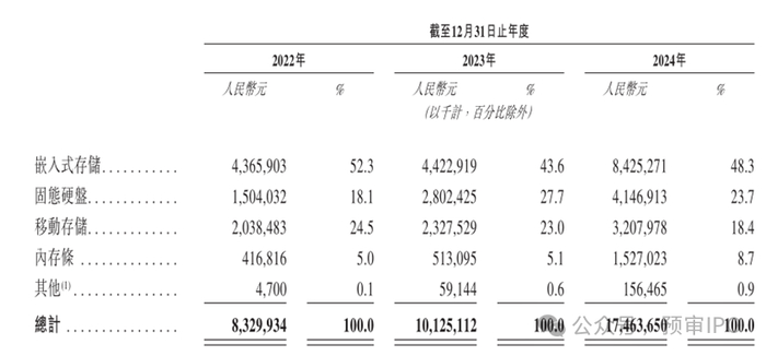 2022年-2024年,江波龙的收入分别为83.3亿元、101.25亿元及174.64亿元,逐年增长。嵌入式存储是江波龙的主要产品线,也是公司主要的收入来源,业务收入占比各期总收入的52.3%、43.6%及48.3%。