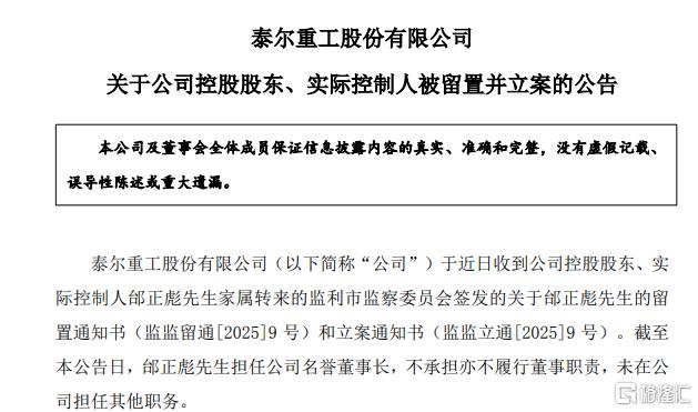 根据公告,泰尔股份于近日收到公司控股股东、实际控制人邰正彪先生家属转来的监利市监察委员会签发的关于邰正彪先生的留置通知书和立案通知书。