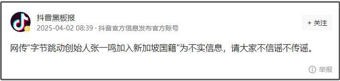 4月2日,抖音黑板报发文辟谣:网传“字节跳动创始人张一鸣加入新加坡国籍”为不实信息,请大家不信谣不传谣。