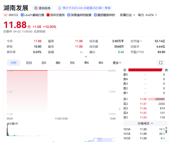 受此利好影响,湖南发展4月2日开盘即一字涨停。