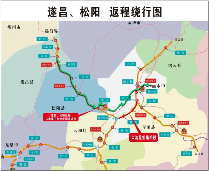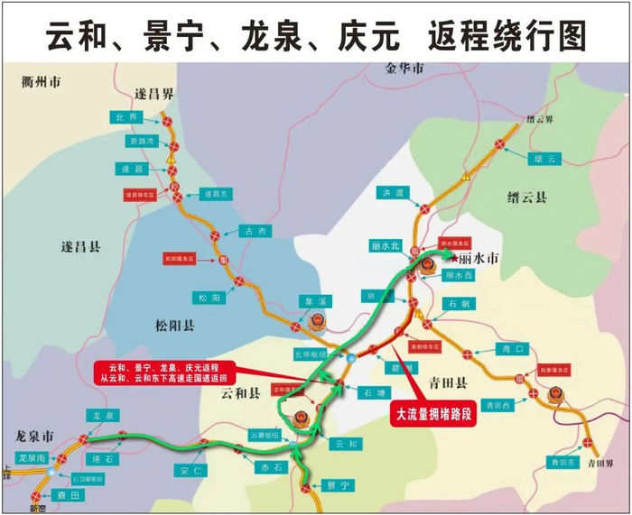 紫金大桥、迎宾大道、城北街等作为主要出入城的主要通道,承载着重大的交通压力,在出入城高峰时段易发生阶段性拥堵;白云山、古堰画乡、九龙湿地等景区周边,处州府城、万地广场、银泰广场、府前菜场、水阁遂松路商业街区等商圈周边因为假期游玩,车辆集中出行的影响,有可能会发生拥堵。