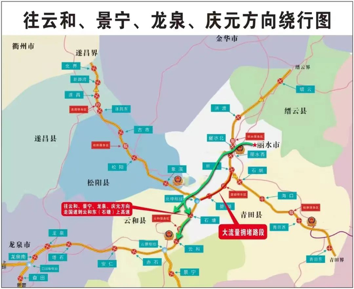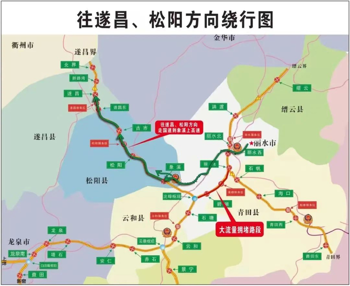 如遇北埠枢纽→富岭枢纽(丽水南)缓行时,避开丽水南下高速,建议参考下图绕行: