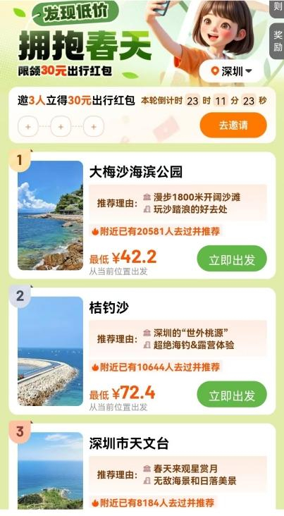 清明假期临近,周边景点游、外出祭扫等跨城出行需求升温。嘀嗒出行近日正式上线“发现低价!拥抱春天”的春季主题赏周边游活动,覆盖北京、上海、广州、深圳、重庆、成都、青岛等全国20个热门城市,通过顺风车低价出行与精选景点推荐,助力用户轻松踏青赏春。