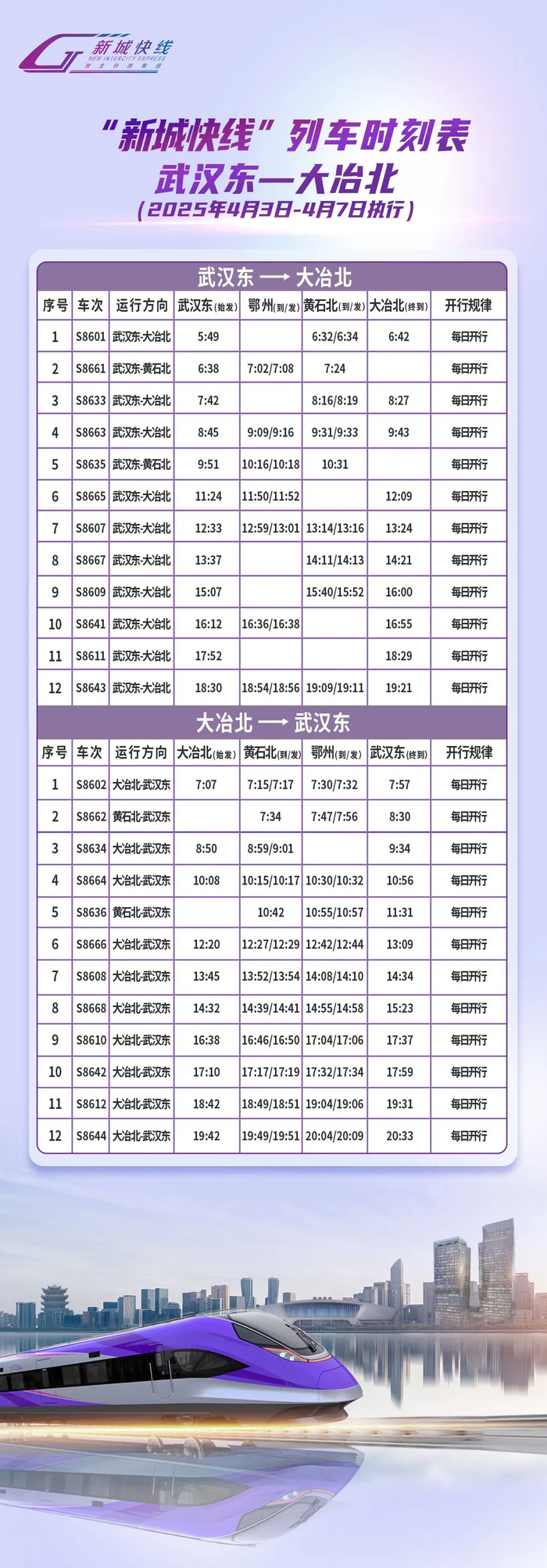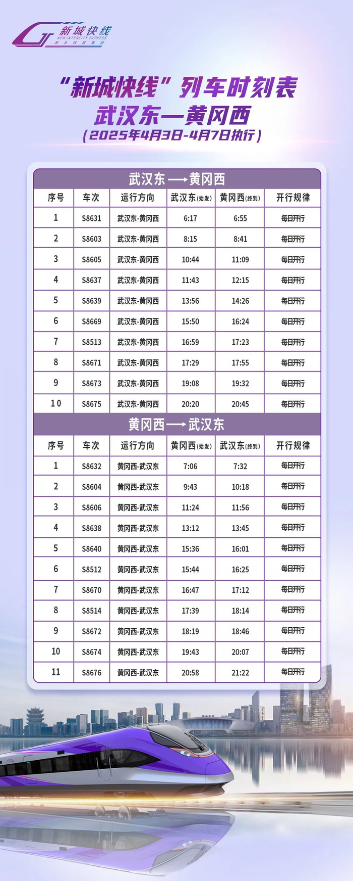 2025年清明节假期运输期限为4月3日至4月7日共计5天,“新城快线”列车将按45列/日开行。列车开行时刻表如下: