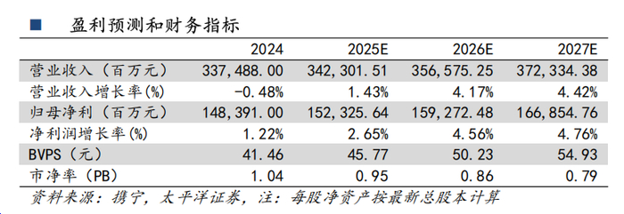 投资建议:公司经营稳中有进,坚持零售为主、均衡发展的特色业务格局,经济修复加速下有望率先受益。预计2025-2027年公司营业收入为3423.02、3565.75、3723.34亿元,归母净利润为1523.26、1592.72、1668.55亿元,BVPS为45.77、50.23、54.93元,对应3月27日收盘价的PB估值为0.95、0.86、0.79倍。维持“买入”评级。