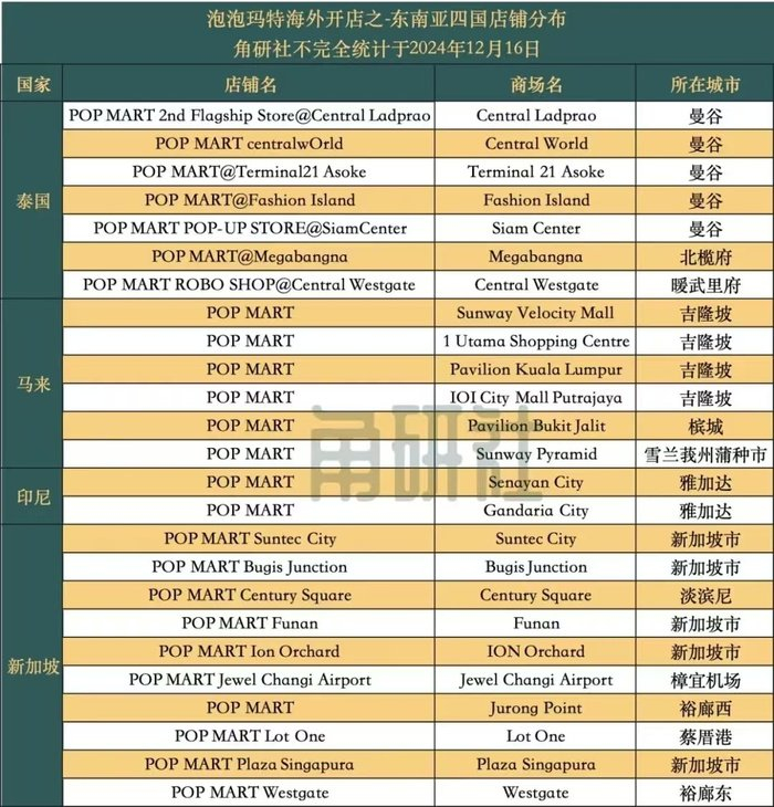 数据喜人,预期更令人振奋。所以,在财报发布后,角研社整理了泡泡玛特在海外的一些动态。比如,东南亚的线下店,开在了哪儿?海外店销销的策略和运营是怎样的?