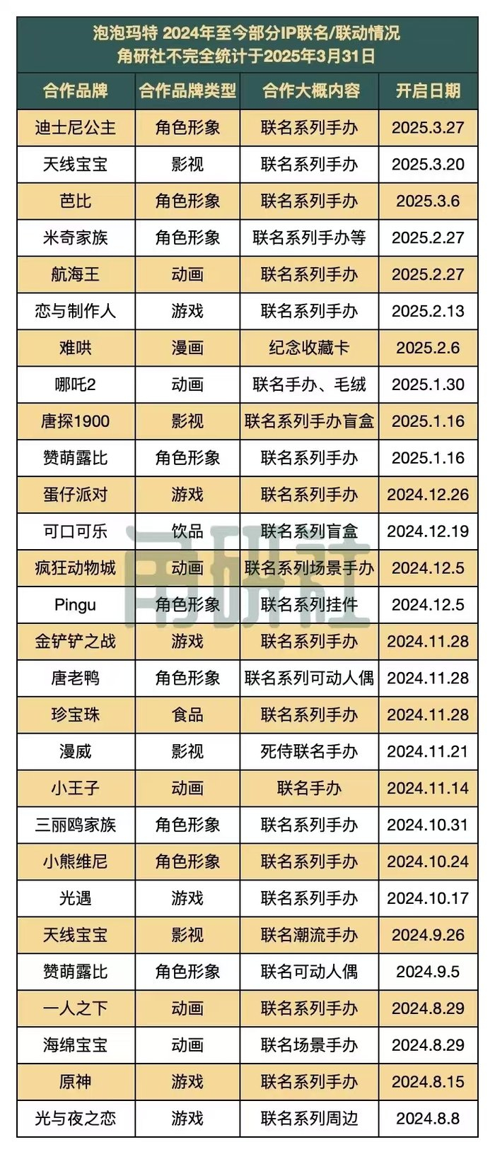 在过去一年多里,泡泡玛特与《原神》、《一人之下》、《哪吒2》、《唐探1900》、“米奇家族”等多个不同类型的IP品牌展开了联名、联动合作。