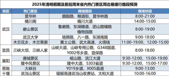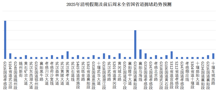G316国道孝感、襄阳段,G318国道潜江、恩施段,S312省道宜昌段,S104省道武汉段,黄冈城北路,黄石矿冶大道,孝感荷沙复线等路段拥堵风险较高。