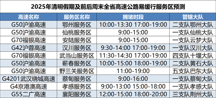 G50沪渝高速仙桃、鄂州、长阳、黄石段,G4201武汉绕城高速江夏、蔡甸段,G4京港澳高速孝感段,G70福银高速云梦段,G42沪蓉高速汉川、黄陂段,S7武鄂高速,G4221沪武高速江岸、罗田段,S1岱黄高速,S8关豹高速江夏段,G55二广高速荆门、襄阳段等高速拥堵风险高。