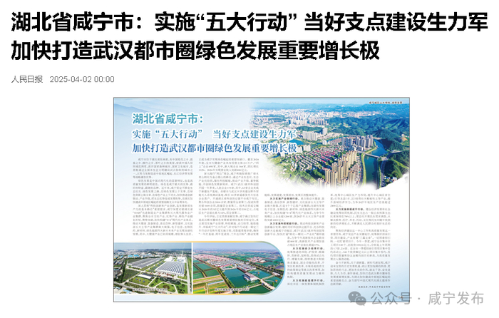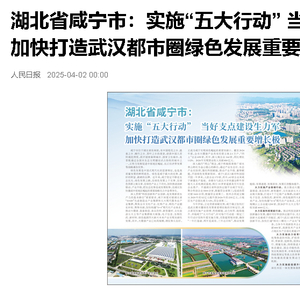 人民日报聚焦咸宁:实施“五大行动” 当好支点建设生力军 加快打造武汉都市圈绿色发展重要增长极