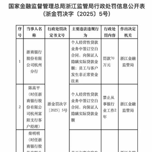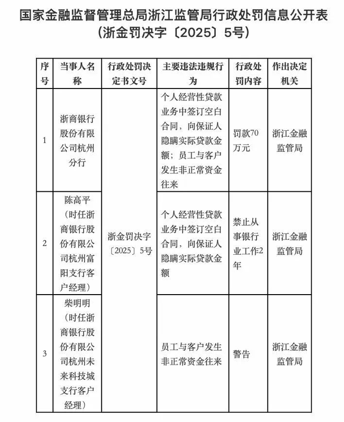 签订空白合同、隐瞒实际贷款金额,浙商银行杭州分行被罚