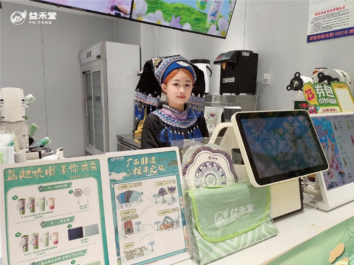 “我们希望消费者手握这把扇子时,不仅能感受到夏日的清凉,更能触摸到壮乡文化的温度。”益禾堂设计团队负责人介绍。活动期间,消费者在广西任意门店购买指定三月三饮品套餐,即可获赠对应限定周边,活动主题门店工作人员还穿着壮族特色服饰,展示壮族人民热情、新潮的民族风貌,将“三月三”的仪式感延伸至日常茶饮场景。