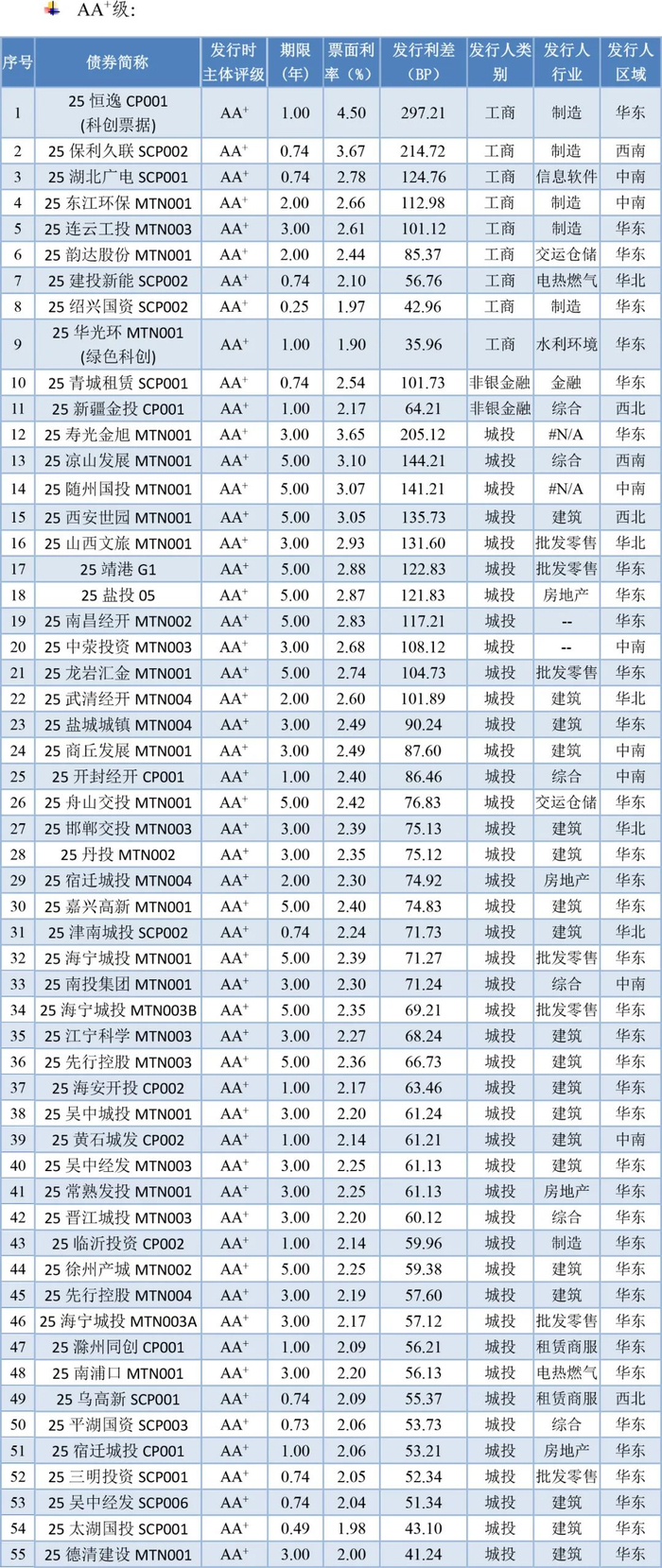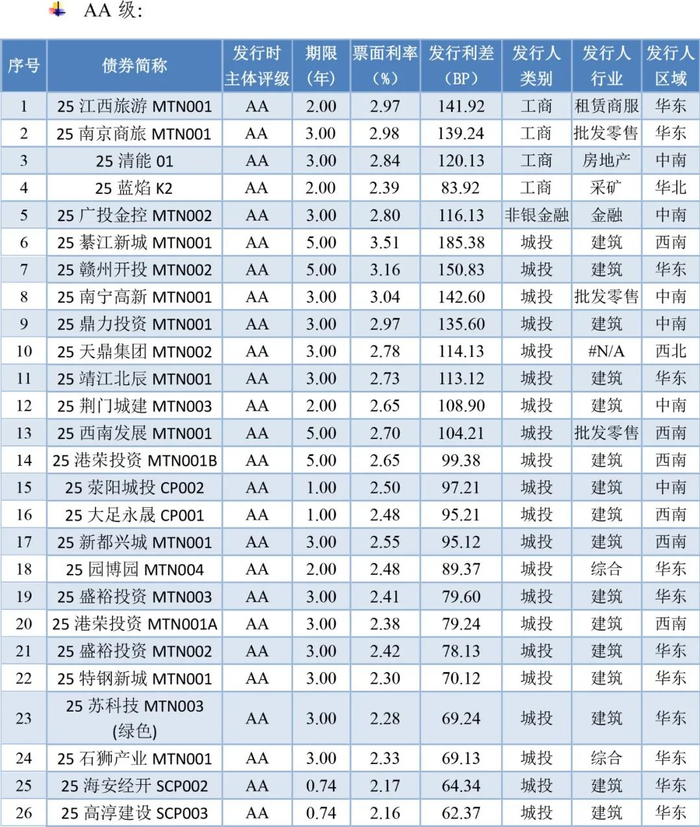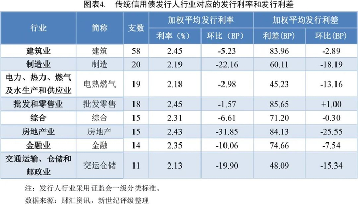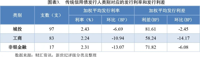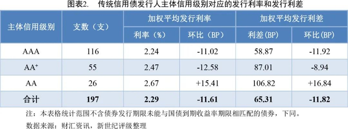 本周纳入利差分析的无债项评级传统信用债161支,发行利率、利差分别为2.26%和61.65BP;有债项评级债券36支,发行利率、利差分别为2.45%和80.16BP。