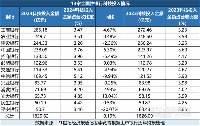 数据显示,除未披露相关信息的浙商银行外,其他13家银行2024年科技投入合计约1829.62亿元,较2023年全年 1826.09亿元增长0.19%,基本与2023年持平。