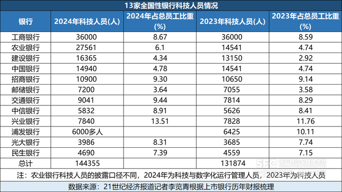 除披露数据不全的平安银行之外,其余12家银行科技人员占总员工的比重全部增加。