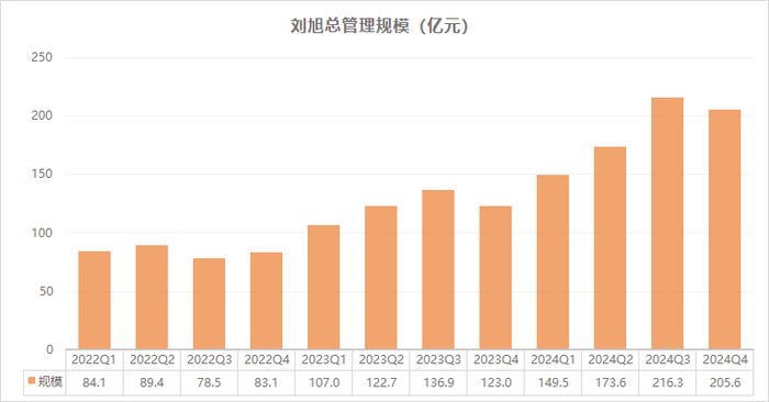 此消彼长之下,刘旭的总管理规模较之于三季度末下降约10.64亿元,达205.65亿元,仍在200亿之上。