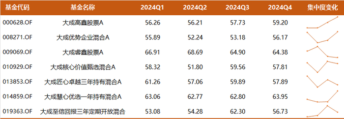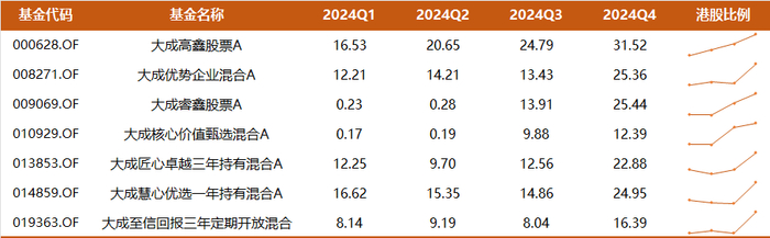 四季度时,加入了大成匠心卓越和大成慧心优选的前十大,其余基金则在“腰部股”中。