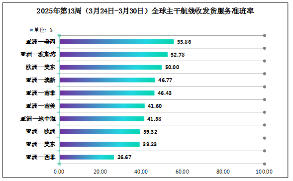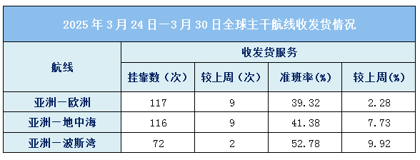 【准班率快报】全球主干航线集装箱班轮准班率(2025年3月24—30日)