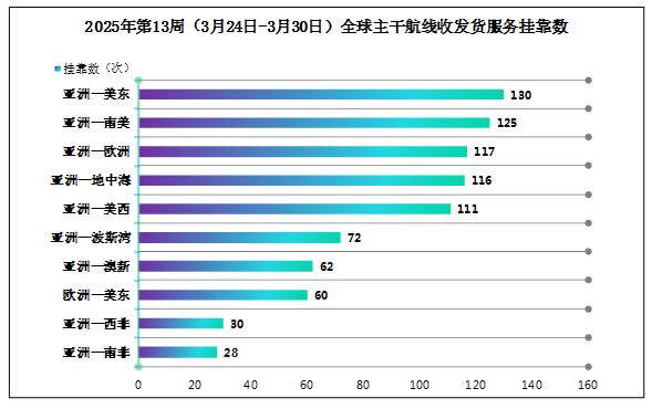 全球主干航线收发货服务挂靠数排名前三的航线为亚洲—美东航线、亚洲—南美航线和亚洲—欧洲航线。其中,亚洲—美东航线挂靠数排名第一,挂靠数为130艘次,较上周增加10艘次;准班率为39.23%,较上周下降0.77个百分点。亚洲—南美航线挂靠数排名第二,挂靠数为125艘次,较上周增加3艘次。亚洲—欧洲航线挂靠数排名第三,挂靠数为117艘次,较上周增加9艘次;准班率为39.32%,较上周上升2.28个百分点。