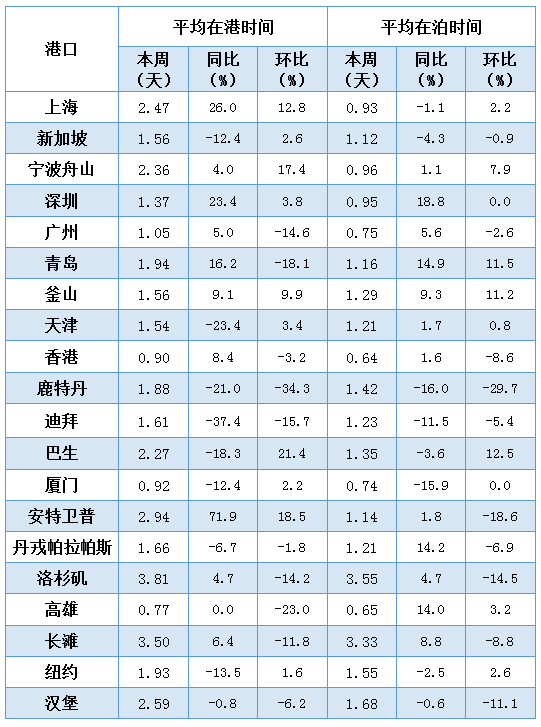 全球主要港口远洋干线国际集装箱船舶在港/在泊时间