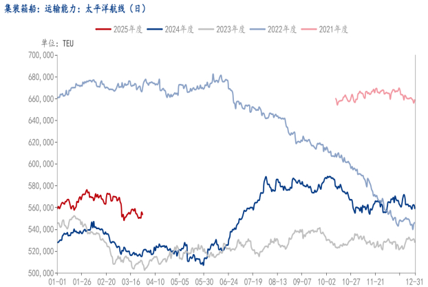 从运力部署来看,4月周均运力28.4wTEU,其中上旬wk14和15的周均运力偏低,分别是27.5wTEU(3个空班)和25.8wTEU(2个空班),下旬空班数量有限,wk16和17的周均运力分别是31.6wTEU(0个空班)和28.9wTEU(2个空班)。MSC在3月底和4月初分别将前期西北欧LION航线撤出的23000TEU大船调回,或是更多基于近期欧线货量回升能更好地支撑装载率的考虑。远端5月周均运力目前统计为29.8wTEU,环比增加5%,同比去年增加17%;关注后续小长假期间的空班计划,作为参考去年4/29-5/5仅1个航次空班(2M的AE44),5/6-5/12有3个航次空班(OA的FAL1和CES以及THE的FE3),上旬运力录得24.7wTEU。