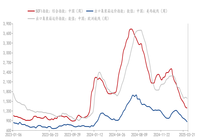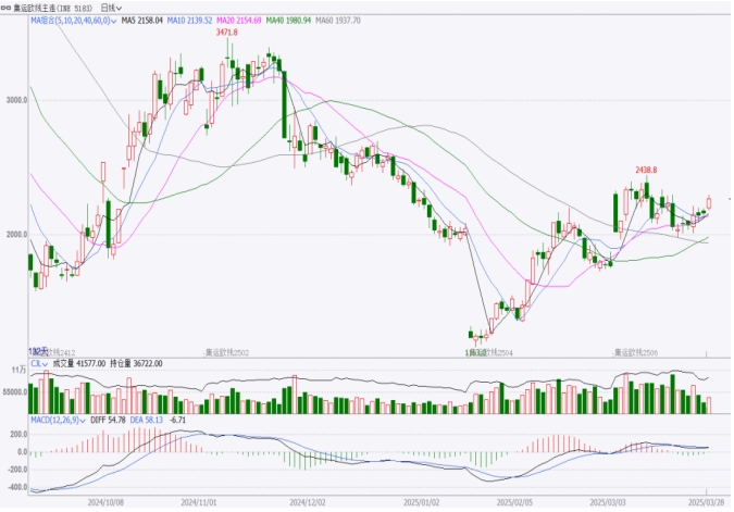3月的开始,上海出口集装箱结算运价指数持续下行,欧洲航线结算运价指数回落至1586.66点,环比下降6%;美西航线结算运价指数下降至859.97点,跌幅为13%。SCFI则收在1292,75点,较上期下跌222.54点或14%。现货价格方面,MSC往后在4月下旬小幅提涨至大柜2390美金后,EMC公布wk15起FAK表价,大柜报2660美金;CMA报4月下旬至大柜2520美金。马士基和PA联盟暂未公布4月下旬报价。整体4月下旬实际运价水平仍需验证需求能否配合较为饱满的供给压力,验证实际涨价落地成色,市场预期逐步转向5月宣涨。市场继续博弈宣涨落地幅度,EC盘面整体维持震荡走势。受美国加关税和地缘因素的反复,EC盘面宽幅震荡,但往后随着旺季的来临和欧洲经济数据的回暖,欧线指数有望向上迎来好转。