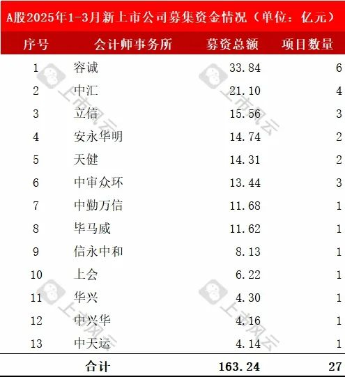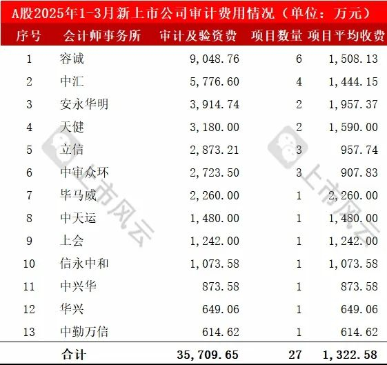 2025年1-3月份共有13家会计师事务所为27家新上市公司提供了IPO审计服务。