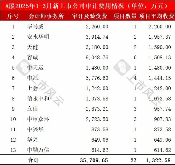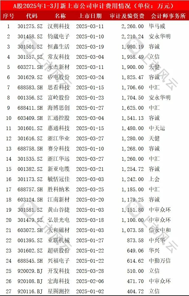 2025年1-3月份,27家A股IPO新上市公司的IPO审计机构、审计验资费用详细如下: